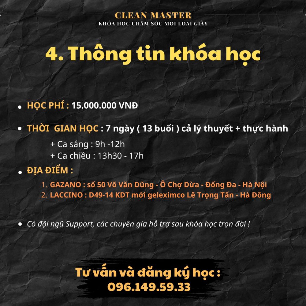 - Thời gian học : 6 ngày liên tục từ 9h30 sáng đến 4h30 chiều